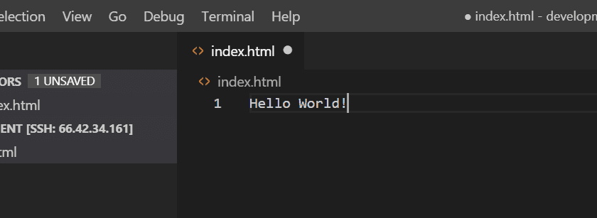 編集が終わったらファイルを保存します。画面の「index.html」と書いてある部分の右側に白い丸が付いていますね。これはファイルが未保存である証です。保存を完了すれば消えてくれます。ファイルの保存にはショートカットキー[Cmd / Ctrl] + [S]が便利です。